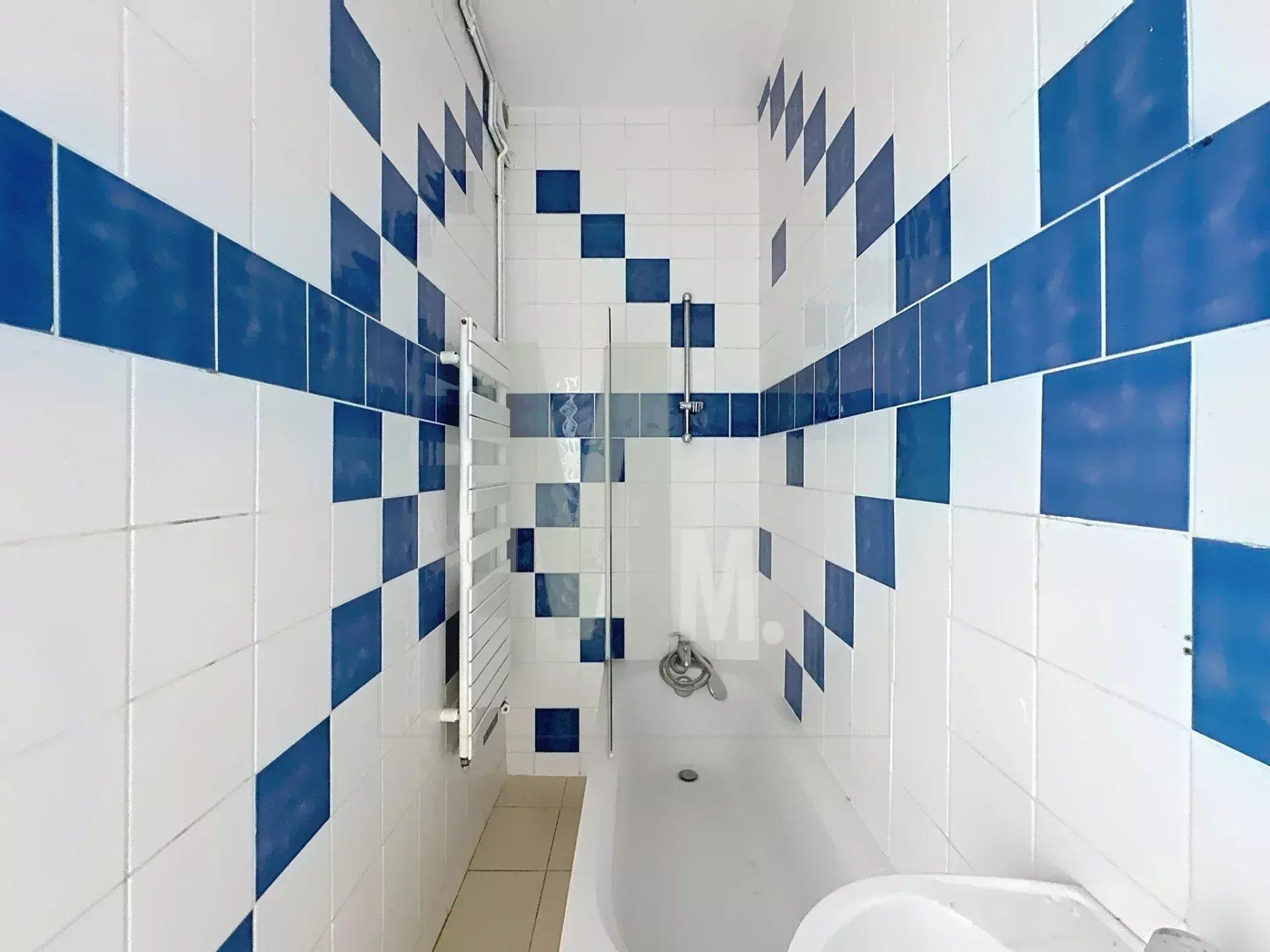 * Salle deau * Salle de bain avec baignoire, vasque et sèche-cheveux.